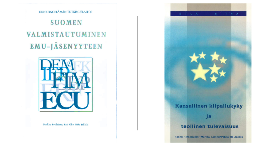 Vasemmalla Markku Kotilaisen, Kari Alhon ja Mika Erkkilän tutkimus ”Suomen valmistautuminen EMU-jäsenyyteen” vuonna 1994 analysoi EMU-jäsenyyttä Suomen näkökulmasta. Oikealla 90-luvulla käynnistyneen Etlan klusteritutkimuksen yksi perusteos.