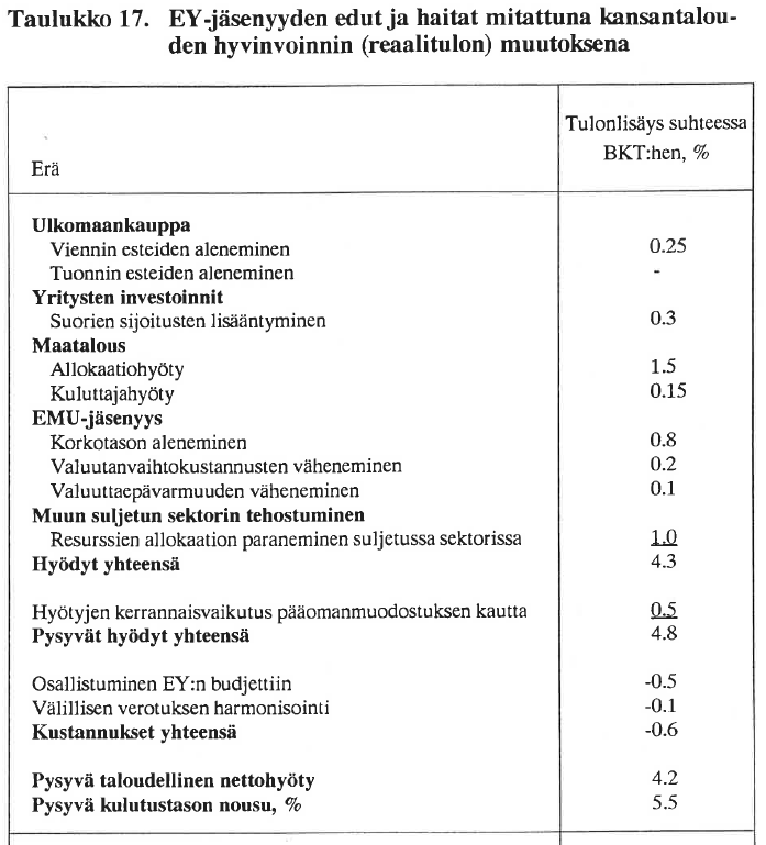 Kari Alhon, Markku Kotilaisen ja Mika Widgrénin kirjoittama ”Suomi Euroopan yhteisössä – arvio taloudellisista vaikutuksista” –raportti arvioi Suomen EY-jäsenyyden kasvattavan kansantalouden reaalituloja pysyvästi noin neljän prosentin verran.