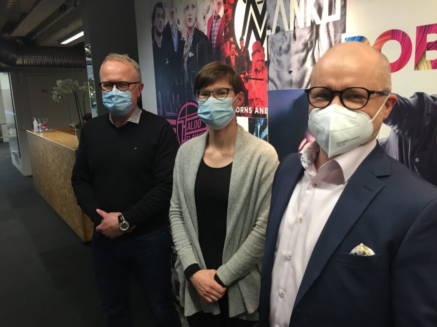 Podcast-nauhoituksissa Tapio Nurminen (vas.), Tuuli Koivu ja Aki Kangasharju. Olli Rehn osallistui nauhoitukseen etäyhteydellä.Etlan toimitusjohtaja Aki Kangasharju painottaa, että Suomessa on ensi vuonna palattava kehyksiin, mikä tarkoittaa ylimääräisen elvytyksen lopettamista.