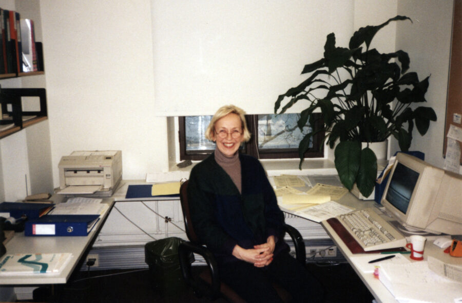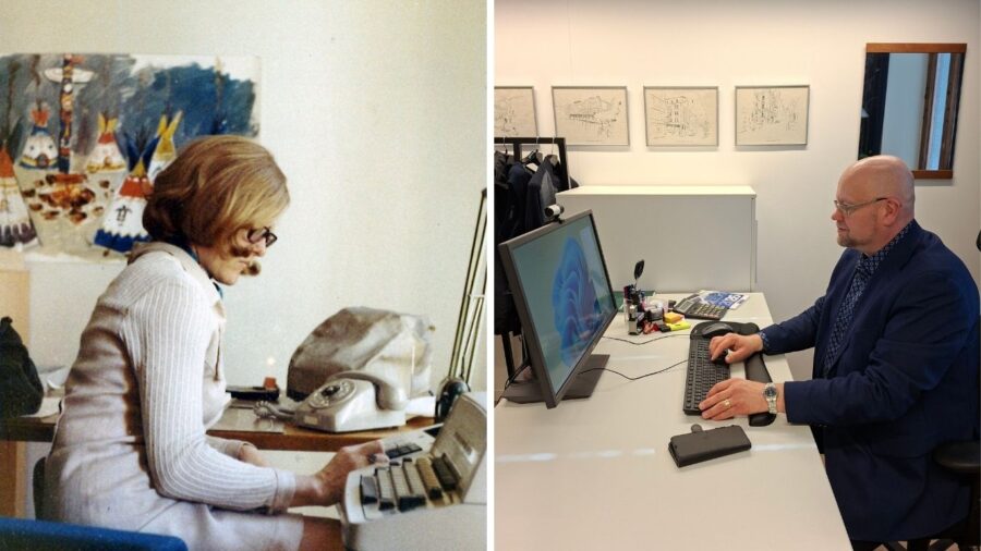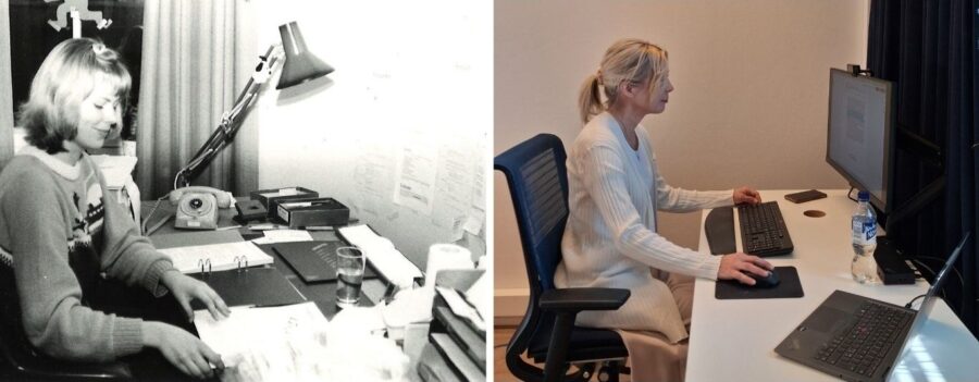 Vasemmanpuoleisessa kuvassa tuntemattomaksi jäänyt etlalainen työskentelemässä paperipinojen ja mappien keskellä noin 1970-luvulla. Uudemmassa kuvassa tutkimusjohtaja Heli Kosken työpöytää eivät enää täytä paperipinot, eikä lankapuhelintakaan näy.