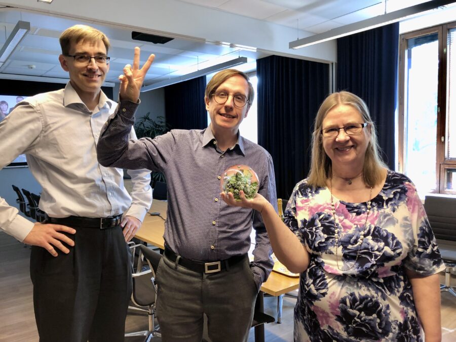 Ennusteryhmä juhlistamassa Vuoden talousennustaja -tittelin voittoa vuonna 2022, vasemmalta Ville Kaitila, Markku Lehmus sekä Birgitta Berg-Andersson.