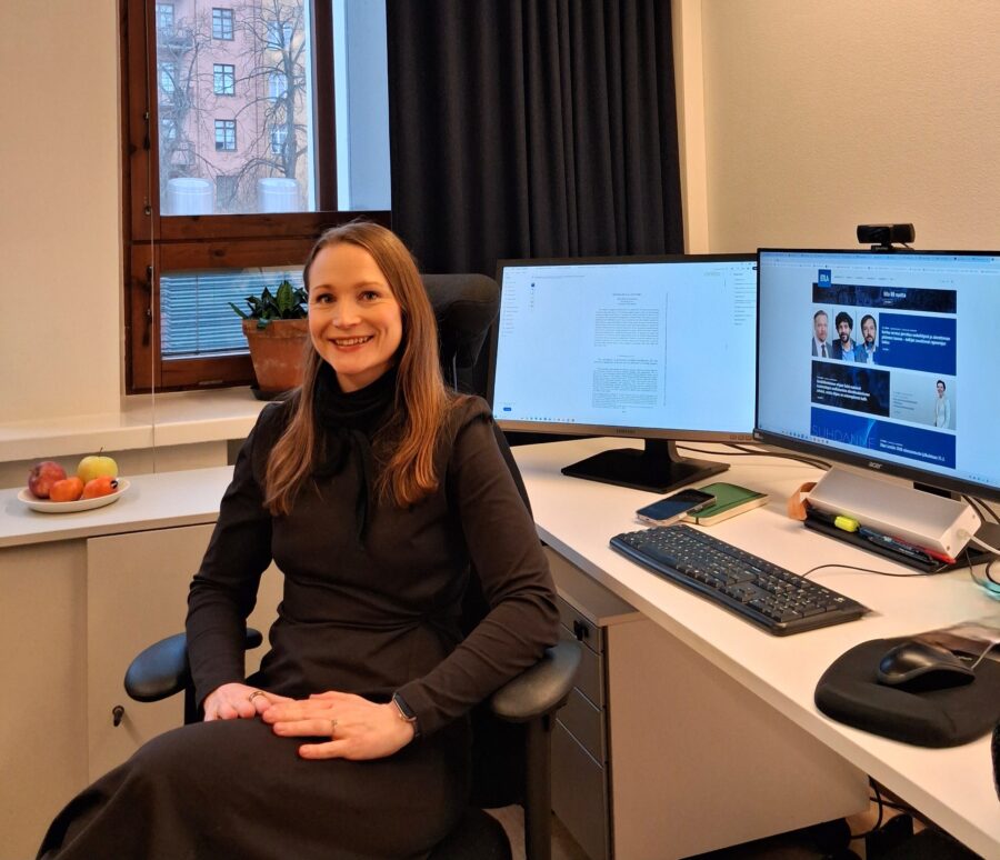Uudemmassa kuvassa poseeraa vanhempi tutkija Krista Riukula työhuoneessaan.