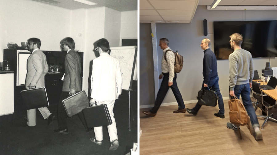 Mustavalkokuvassa Paavo Suni, Pekka Ilmakunnas ja Tarmo Valkonen vuonna 1986. Oikeanpuoleisessa kuvassa tyylinäyte vuodelta 2026: Jyrki Ali-Yrkkö, Olli Ropponen sekä Jaakko Markkanen.
