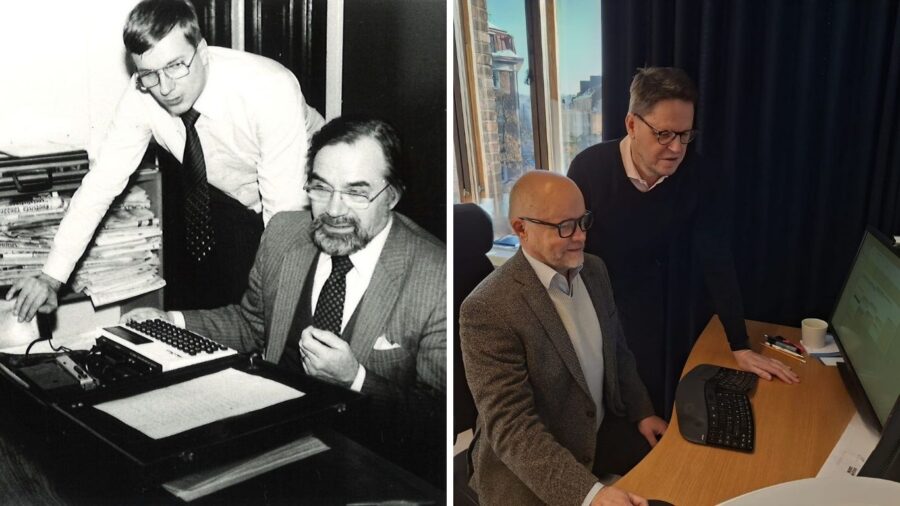 Vasemmalla Etlan tuntemattomaksi jääneitä asiantuntijoita arviolta 1970-luvulla. Aikalaistiedon perusteella työn alla on mahdollisesti Etlan makromallin virittelyä. Oikeanpuoleisessa kuvassa Etlan toimitusjohtaja Aki Kangasharju ja tutkimusneuvonantaja Petri Rouvinen vuonna 2026.