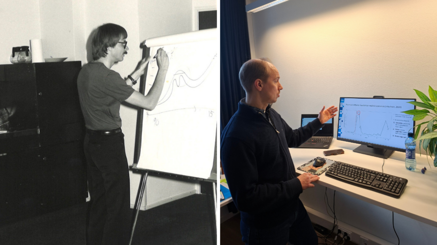 Vasemmanpuoleisessa kuvassa Pekka Ilmakunnas vuodelta 1986. Tuoreessa kuvassa Etlan tutkimuspäällikkö Olli Ropponen helmikuussa 2026.