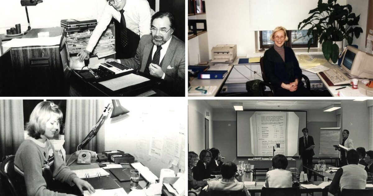 Vasemmanpuoleisessa kuvassa tuntemattomaksi jäänyt etlalainen työskentelemässä paperipinojen ja mappien keskellä noin 1970-luvulla. Uudemmassa kuvassa tutkimusjohtaja Heli Kosken työpöytää eivät enää täytä paperipinot, eikä lankapuhelintakaan näy.