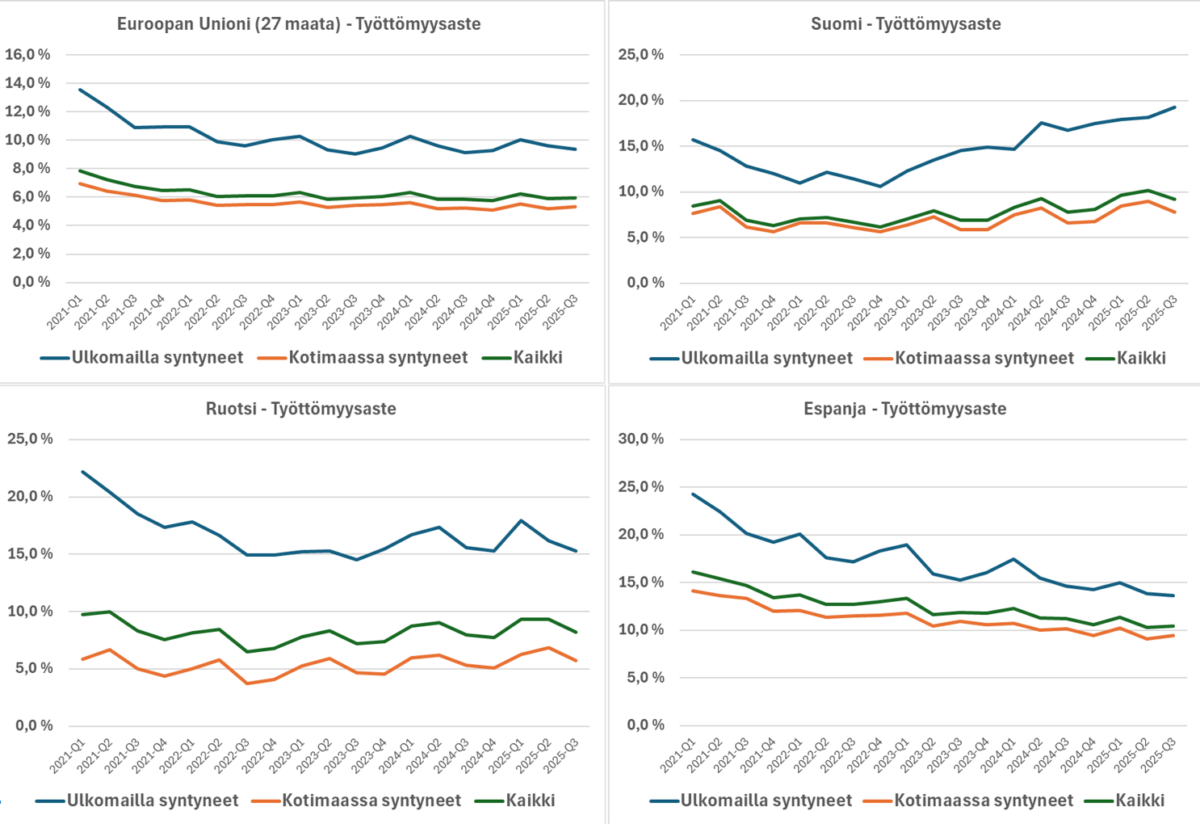 Muualla syntyneiden työvoima (työlliset + työttömät) on kasvanut Suomessa vuoden 2022 alusta (2022q1) vuoden 2025 kolmannelle neljännekselle noin 26 prosenttia samaan aikaan, kun verrokkimaassa Ruotsissa se on kasvanut noin 13 prosenttia. Suuriin maihin vertaaminen lienee harhaanjohtavaa, koska ne vetävät oletettavasti puoleensa enemmän myös EU:n sisäisiä muuttajia. On kuitenkin huomionarvoista, että Espanjassa muualla syntyneiden työvoima on kasvanut samalla ajanjaksolla noin 28 prosenttia. Tästä huolimatta Espanjassa, jossa talous on kasvanut mainiosti viime vuosina, työttömyysaste on jatkanut vuoden 2022 jälkeenkin trendimäisessä laskussa niin ulkomailla kuin kotimaassa syntyneiden keskuudessa.