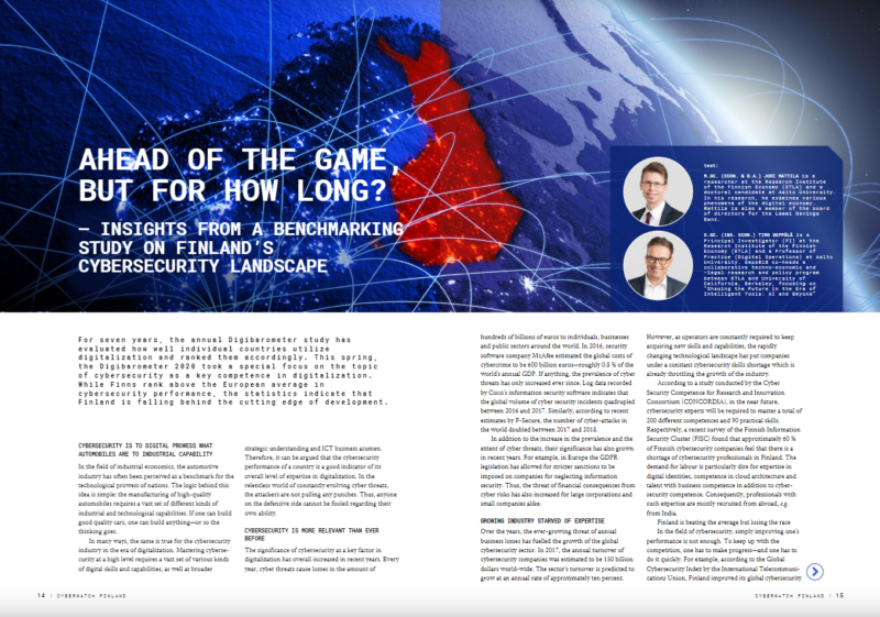Juri Mattilan ja Timo Seppälän artikkeli ”Ahead of the game, but for how long? – Insights from a benchmarking study on Finland’s cybersecurity landscape” julkaistiin heinäkuussa 2020 Cyberwatch Finland -lehdessä (No. Q2/2020, pp. 14–16).
