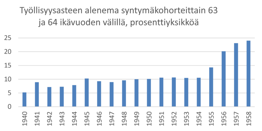 Selitys oli eläkeiän 63 vuoden ikäraja. Tämä näkyy erityisen selvästi siinä, miten nopeasti työllisyysasteen alenema lähti pienenemään, kun eläkeikää vähitellen nostettiin. Vuonna 1958 syntyneellä kohortilla eläkeikä oli jo 64 vuotta, ja alenema vain muutamia prosenttiyksiköitä.