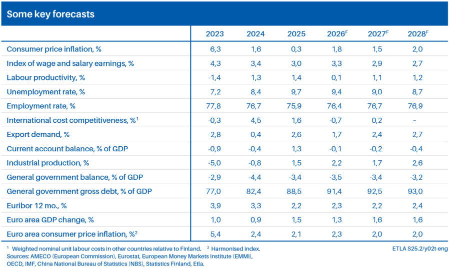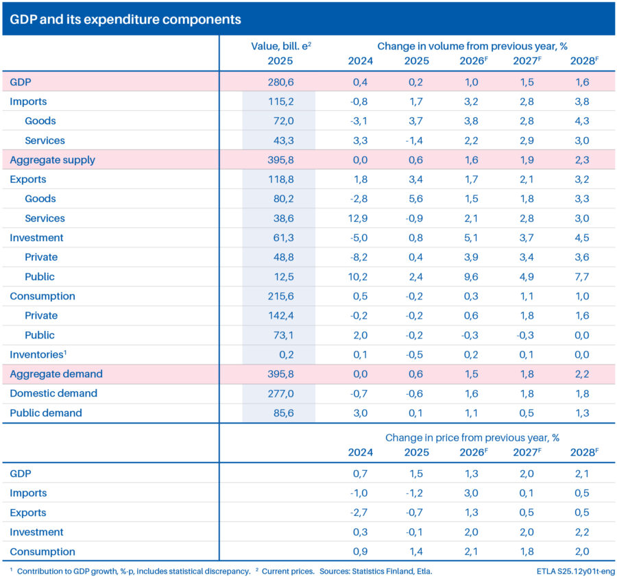 The Finnish economy shifted to modest growth at the turn of the year 2025–2026 and is expected to continue to grow this year as well. Etla forecasts that gross domestic product will grow by 1 percent this year and 1.5 percent next year. In 2028, growth will reach 1.6 percent.