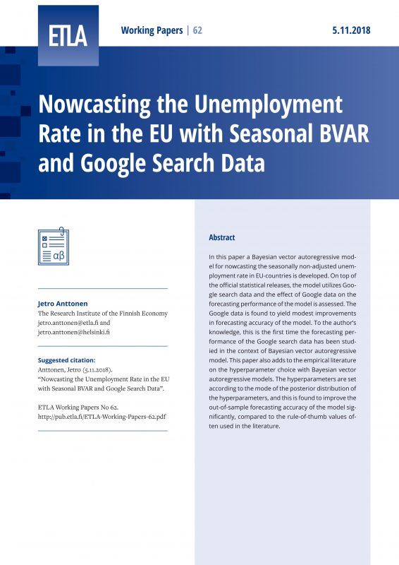 Tässä tutkimuksessa kehitetään kausiluontoinen bayesiläinen vektoriautoregressiivinen malli työttömyystason ennustamiseksi EU-maissa. Virallisten tilastojulkaisujen lisäksi malli käyttää ennustamiseen Googlen hakudataa ja tutkimuksessa tarkastellaan Googlen hakudatan käyttökelpoisuuttaa työttömyystason ennustamiseksi. Googlen hakudatan havaitaan parantavan mallin ennustetarkkuutta vain hieman. Kirjoittajan tiedossa ei ole aikaisempia tutkimuksia, jotka tarkastelisivat Googlen hakudatan käyttökelpoisuutta ennustamisessa käyttäen bayesiläisiä vektoriautoregressiivisiä malleja. Tässä tutkimuksessa tarkastellaan myös hyperparametrien valinnan merkitystä bayesiläisen vektoriautoregressiivisen mallin ennustetarkkuudelle. Hyperparametreille muodostetun marginaalisen posteriorijakauman moodin käyttämisen havaitaan parantavan mallin ennustetarkkuutta huomattavasti, verrattuna kirjallisuudelle tyypillisiin ennalta määrättyihin arvoihin.
