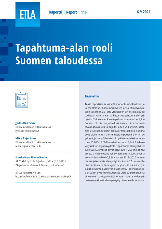 In this study, we analyse the size and role of the Finnish event industry by utilising both industry- and firm-level data. Furthermore, we study the impacts of the Covid-19 crisis on companies operating in the event industry. Based on our results, the event industry accounts for 1.2% of the Finnish GDP. It should be noted that in addition to companies, the event industry consists of associations, foundations and other non-profit organisations. Depending on the definition, the Finnish event industry included in 2019 approximately 8,354–9,126 companies with 15,200–19,500 employees (full-time equivalent), which corresponds to 0.9–1.2% of the employment of all companies. The companies operating in the event industry generated EUR 800–1,200 million value added, corresponding to 0.6–0.9% of the value added of all companies. The turnover decreased between 2019 and 2020 for 70% of these companies. In every fourth of the companies, turnover decreased by at least 50%. Due to update delays of the firm-level data, these shares are probably downward biased because we were not able to take into account the role of companies that that ceased operations.